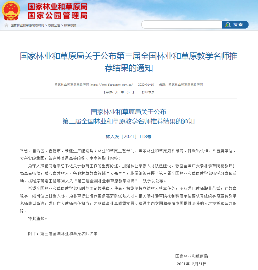 1月10日,国家林业和草原局公布了第三届全国林业和草原教学名师推荐结果,我校张英杰教授获全国林业和草原教学名师称号。