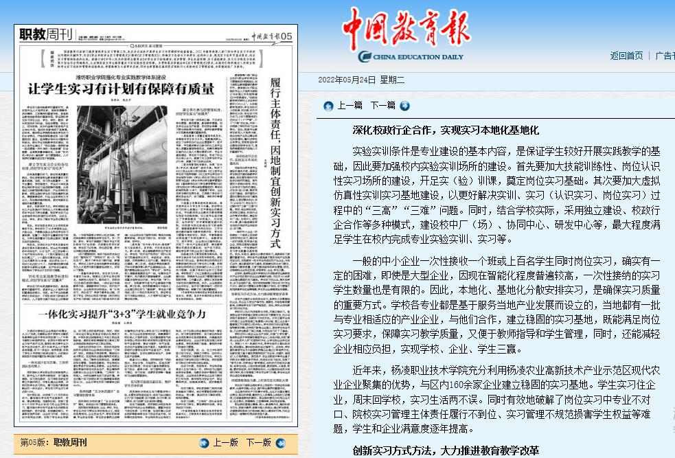5月24日,《中国教育报》5版刊发了我校校长王周锁署名文章《履行主体责任,因地制宜创新实习方式》,全文刊载如下: