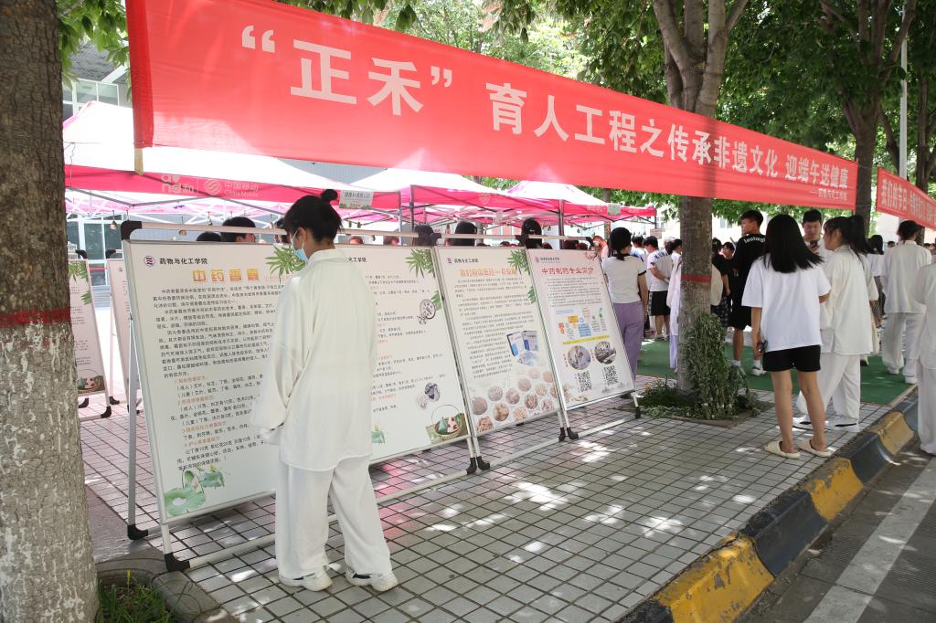 药物工程学院在西、南校区举行了“正禾”育人工程之“传播非遗文化 迎端午 送健康”主题活动。活动主要包含八段锦表演、汉服舞蹈、做香包、传统手工制做山楂丸、投壶、中医药文化宣传和中医药养生科普知识资料发放等。活动现场,汉服爱好者穿上华美汉服,展现中华传统服饰之美。中医药专业的学子在香包内放入自己炮制、研磨、制作的中药材,外观精美,气味幽香,深受现场师生的欢迎。为了赢得精美香包,大家踊跃参加投壶比赛,现场体验了一把“穿越”的乐趣。