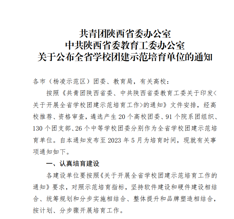 据悉,按照《共青团陕西省委、中共陕西省委教育工委关于印发<关于开展全省学校团建示范培育工作>的通知》文件安排,经高校推荐、资格审查,遴选产生了20个高校团委、91个院系团组织、130个团支部分别作为全省学校团建示范培育单位。培育时间为2022年7月至2023年5月。