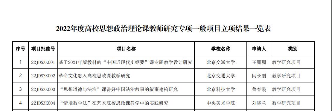 经教育部社科司组织专家严格评审和面向社会公示,2022年度高校思想政治理论课教师研究专项一般项目共有198项批准立项。其中,陕西省共有11个项目获批,崔巧玲主持的项目为全省高职高专两个立项之一。