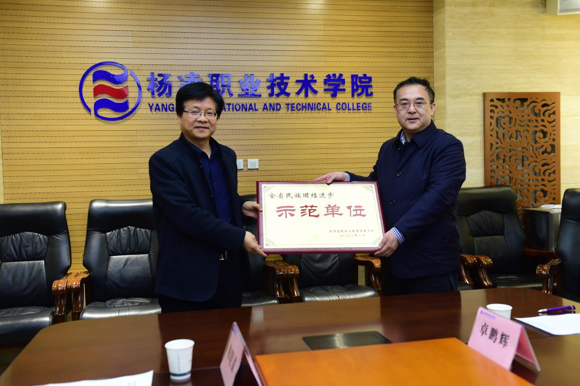 3月23日,学校举行“全省民族团结进步示范单位”授牌仪式。省民宗委党組成员、副主任王晓斐,民族一处处长张岩松,省民宗委民族一处二级调研员严鹏博,杨凌示范区党工委统战部一级调研员王勇林,我校党委副书记任得元、党委统战部部长田争运、党委学工部部长陈军峰、党委保卫部部长周宁等参加授牌仪式。授牌仪式由党委副书记任得元主持。