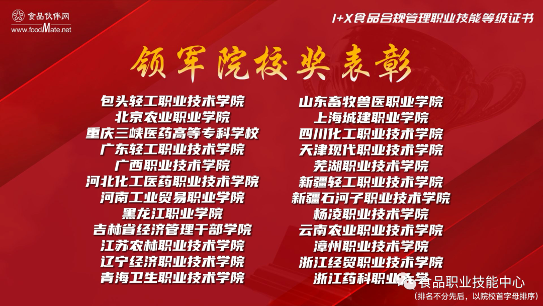 近期,食品合规管理职业技能等级专家委员会公布了2022年度1+X食品合规管理职业技能等级证书试点工作优秀院校及个人名单,我校荣获“领军院校奖”和“优秀组织奖”。