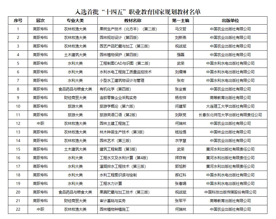 近日,教育部公布了首批“十四五”职业教育国家规划教材书目名单,我校共有22本教材成功入选,其中“十三五”复核教材12本,新申报教材10本。