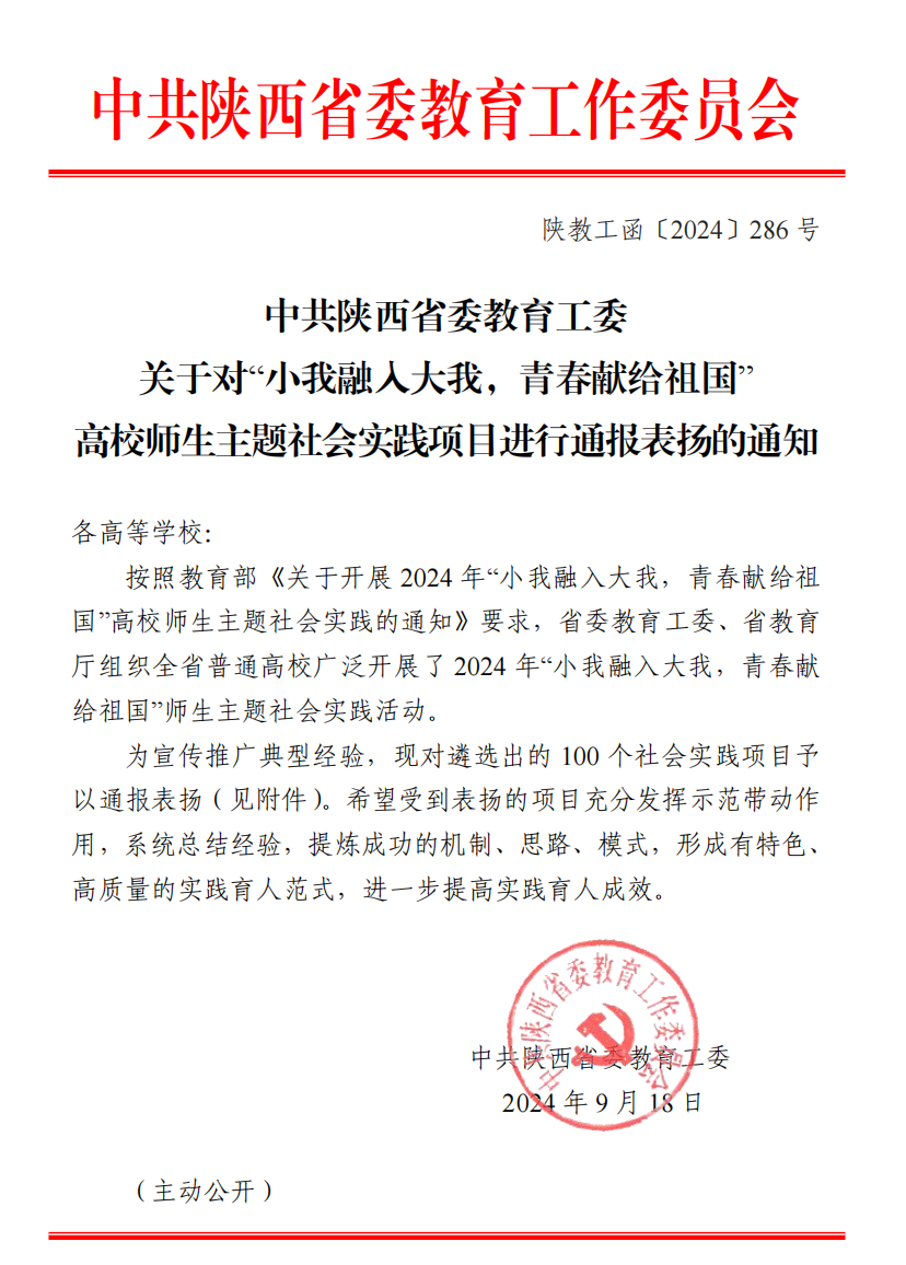 9月18日,省委教育工委对2024年“小我融入大我,青春献给祖国”高校师生主题社会实践项目进行了通报表扬,学校“用文明实践与禁毒教育点亮社区儿童暑期公益夏令营”实践项目获通报表扬。