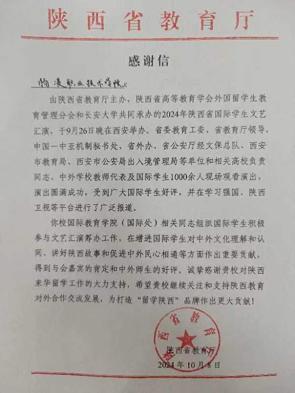 10月8日,省教育厅发来感谢信,肯定我校在2024年陕西省国际学生文艺汇演活动中的表现。信中表示,学校大力支持陕西来华留学工作,国际教育学院积极组织国际学生参与2024年陕西省国际学生文艺汇演筹办工作,希望学校继续关注和支持陕西教育对外合作交流发展,为打造“留学陕西”品牌作出更大贡献。