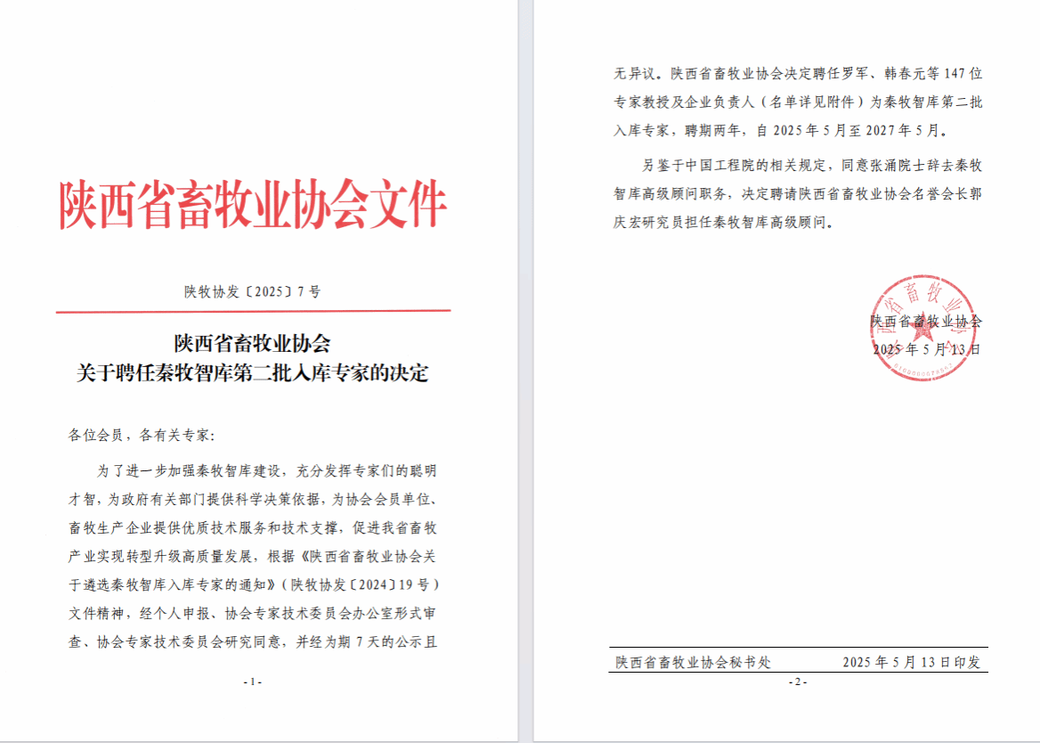 5月13日,陕西省畜牧业协会发布了关于聘任秦牧智库第二批入库专家的决定,学校动物工程学院张周、张振仓、田万强、高睿、牛华峰、仇薪鑫、周庆安、罗艳、贾燕青、薛增迪、闫红军、张曼12名教师受聘。