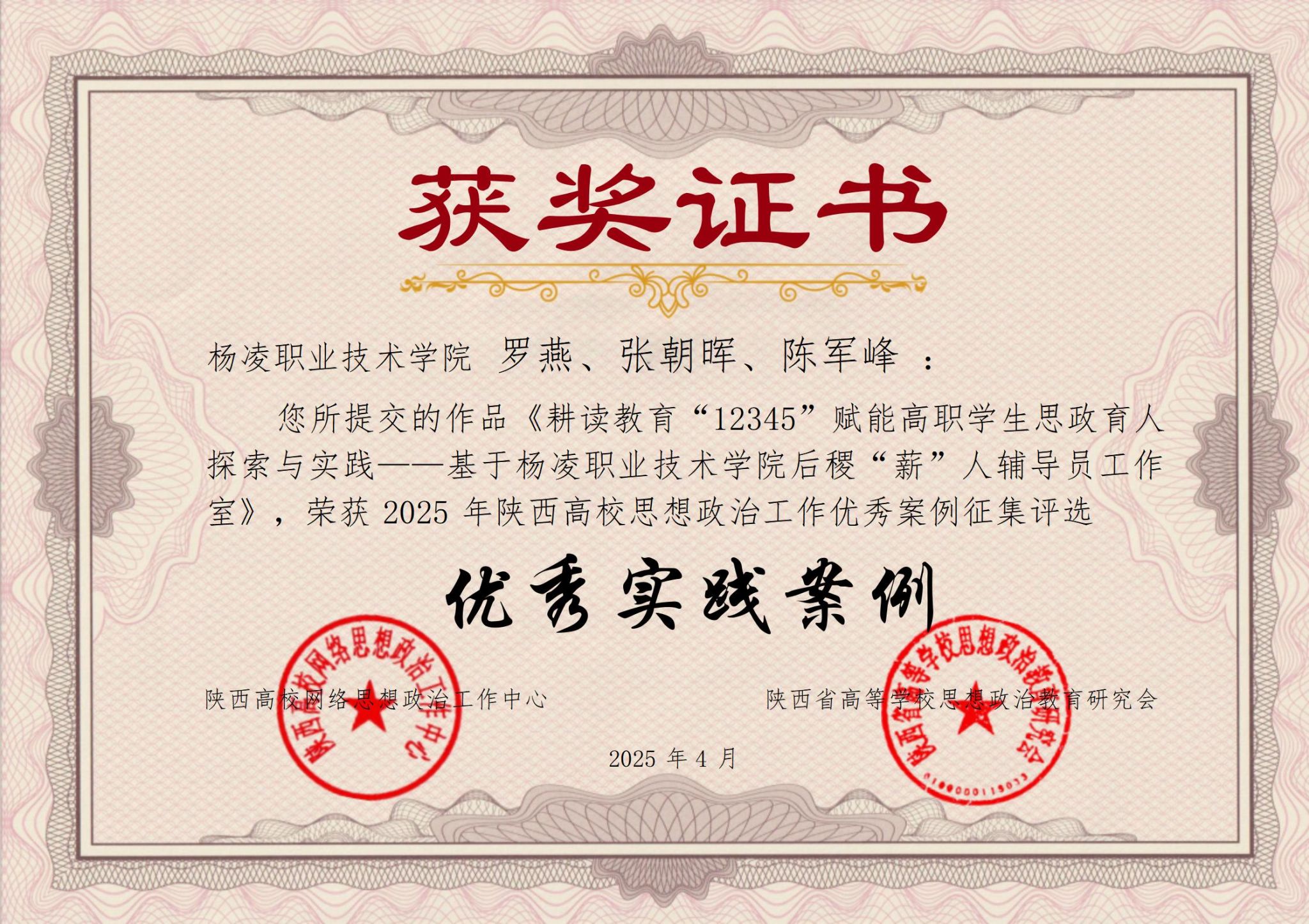近日,由陕西高校网络思想政治工作中心、陕西省高等学校思想政治教育研究会开展的2025年陕西高校思想政治工作优秀案例征集活动评选结果揭晓。我校报送的案例《耕读教育“12345”赋能高职学生思政育人探索与实践——基于杨凌职业技术学院后稷“薪”人辅导员工作室》入选陕西高校思想政治工作优秀实践案例。
