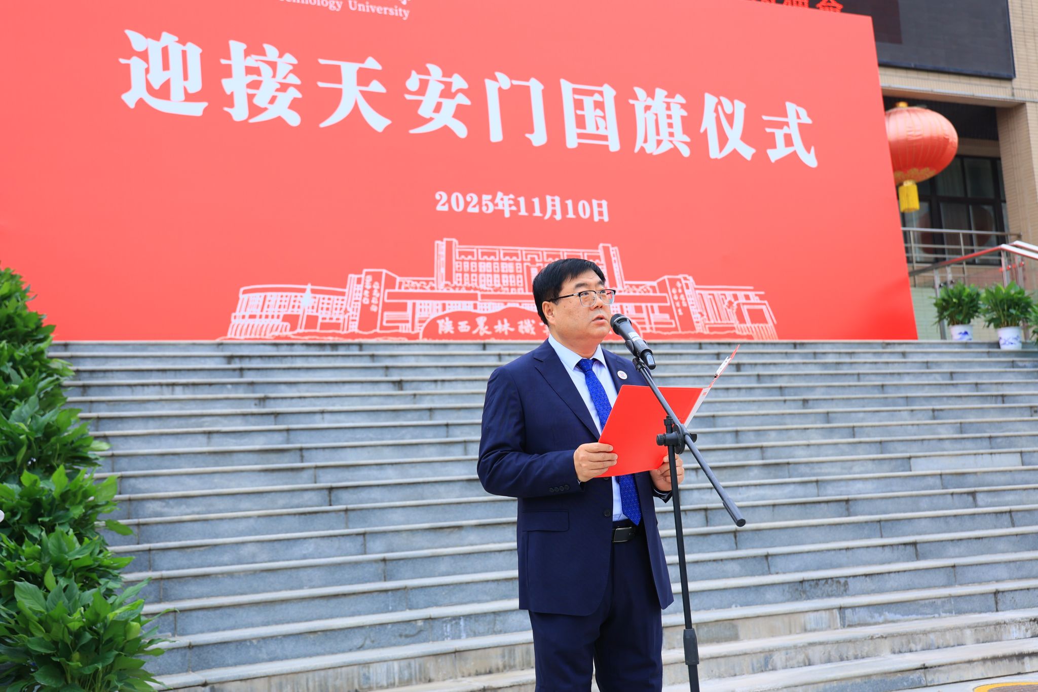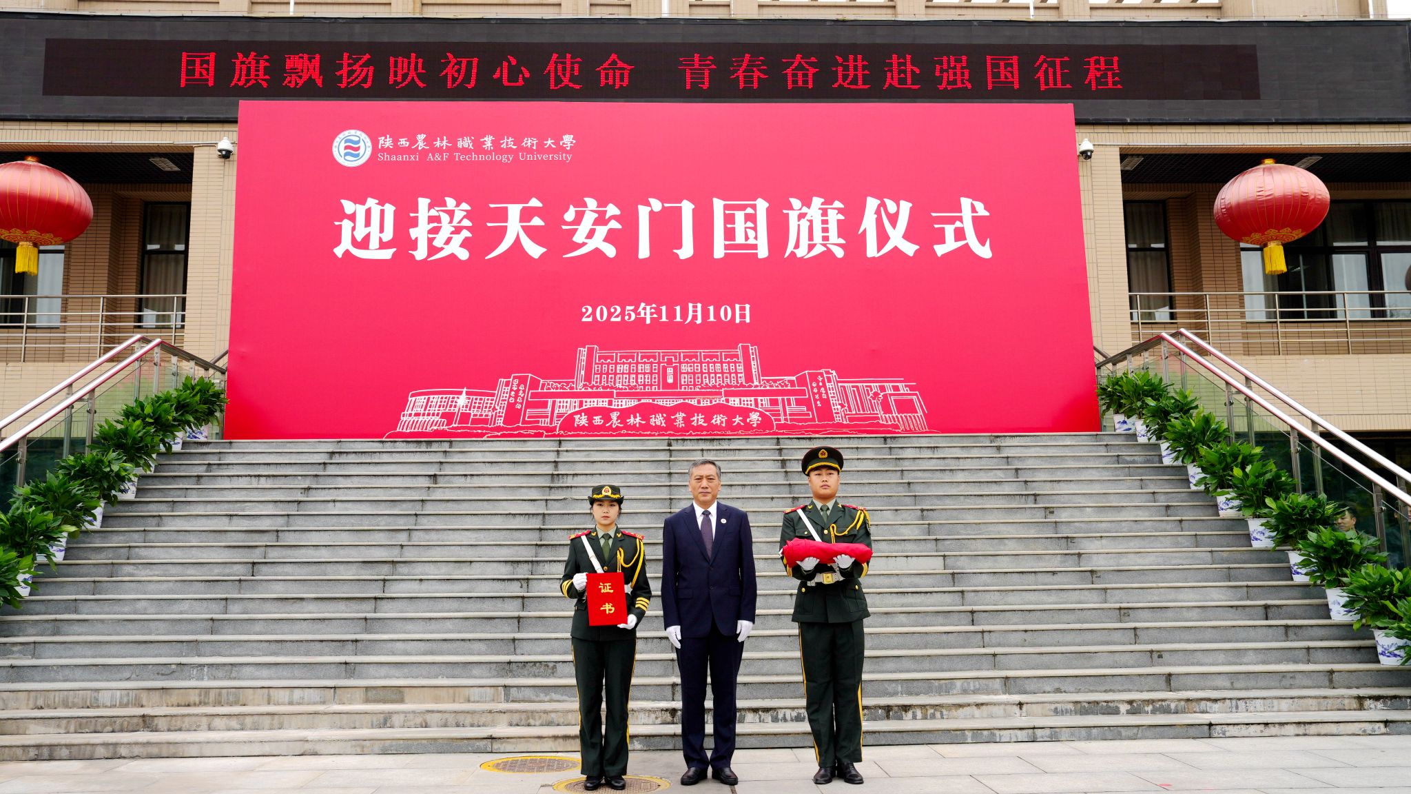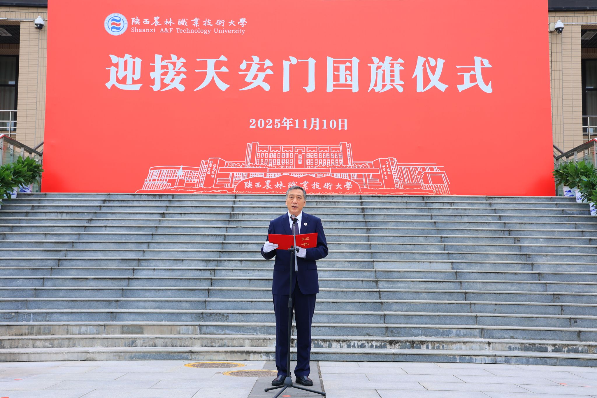 上午10时,仪式在雄壮的国歌声中正式开始。党委书记韩明军郑重宣读了由北京市天安门管理委员会颁发的获赠证书。他介绍,10月31日,北京市天安门管理委员会向学校赠送了2025年6月9日在天安门广场升挂的国旗。6月9日当天,天安门广场天气晴朗,风和日丽,该面编号为2025-0160的国旗,长5米,高3.3米,重1800克,整幅旗面无拼接,五颗五角星采用人工丝网印染工艺,于当天上午4时46分在天安门广场冉冉升起、迎风飘扬。国旗是国家的象征和标志,天安门广场升挂的国旗具有唯一性和特殊的历史价值,是蕴含特殊意义的爱国主义教育载体,承载着亿万中华儿女深厚爱国情怀。值得特别铭记的是,2025年6月9日也是教育部发文批准设立陕西农林职业技术大学之日,获赠2025年6月9日在天安门广场升挂的国旗,是对学校办学91年最好的总结,也承载着国家对陕西农林职业技术大学的殷殷期望,我们一定按照习近平总书记的嘱托,矢志强农报国,努力培养更多知农爱农的专业人才,为建设农业强国、推进中国式现代化作出新的贡献。