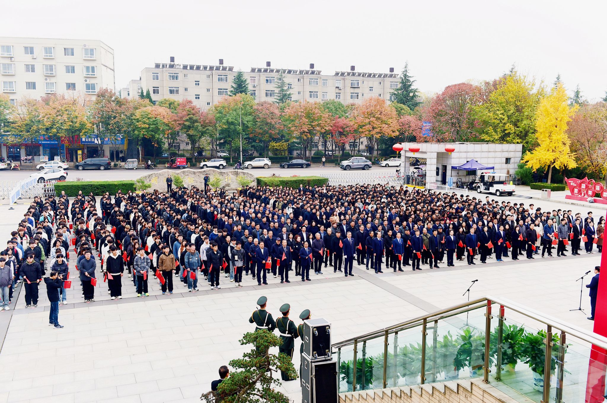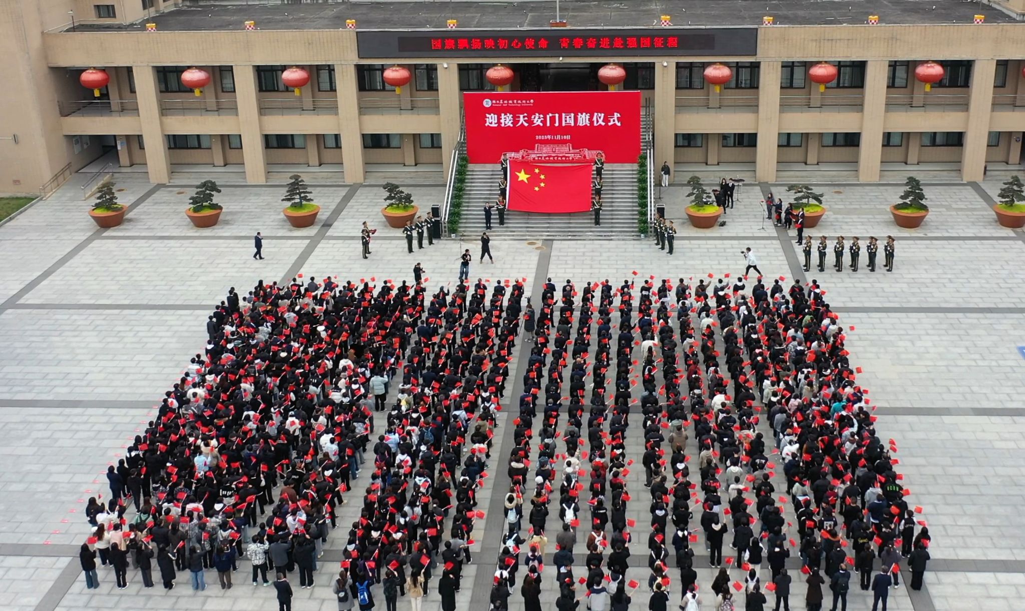 11月10日上午,学校在南校区醒钟楼广场举行迎接天安门国旗仪式。党委书记韩明军,校长仲伟周,党委副书记刘瑞明,党委副书记王勇胜,党委副书记、纪委书记、监察专员康强,副校长祝战斌、胡俊鹏出席仪式。学校党委委员、处科级干部、离退休教师代表、在职教师代表和学生代表,共计1000余人参加仪式。仪式由党委副书记刘瑞明主持。
