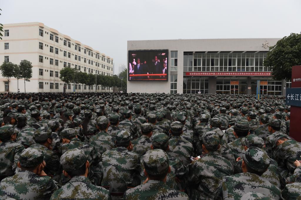 当70响轰隆的礼炮拉开纪念仪式的序幕时,师生不约而同地全体起立;当五星红旗迎着微风飘扬在天安门广场时,师生们高唱国歌,自豪之情油然而生。盛大的阅兵式开始,雄壮的乐曲声中,同学们凝神关注,激动的神情和自豪的感觉仿佛已经写在了脸上。在场的师生们深深为“壮我国防、扬我军威”的阅兵场面所震撼。当习近平总书记高呼“正义必胜!和平必胜!人民必胜!”时,所有的收看点现场沸腾了,掌声、欢呼声久久不息。