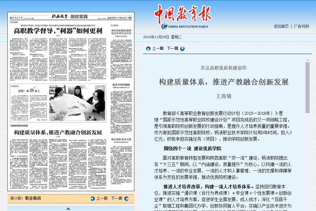 11月29日,《中国教育报》10版刊发了我院王周锁院长署名文章《构建质量体系 推进产教融合创新发展》,全文刊载如下(详情进入):