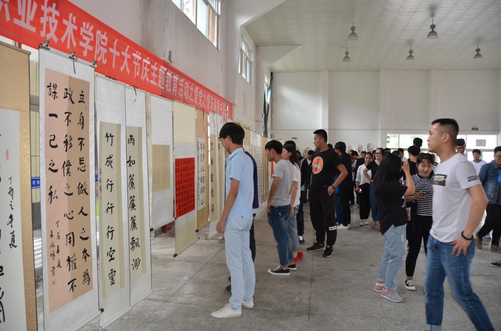 为喜迎党的十九大胜利召开,展示学院“四位一体”素质教育成果,6月5日下午,由学院团委和书画艺术中心主办、动物工程分院团总支承办的“党在我心中,喜迎十九大”暨“十大节庆主题教育活动之爱党之情”朱琳博书法作品展在南校区一卡通中心举行。
