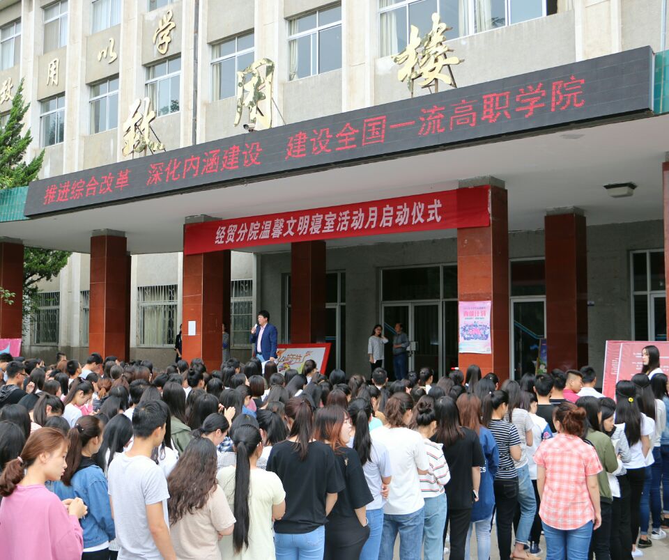 6月5日下午,经济与贸易分院一、二年级四十多个班级的全体同学在北校区致用楼前举行 “温馨、文明寝室活动月”启动仪式。