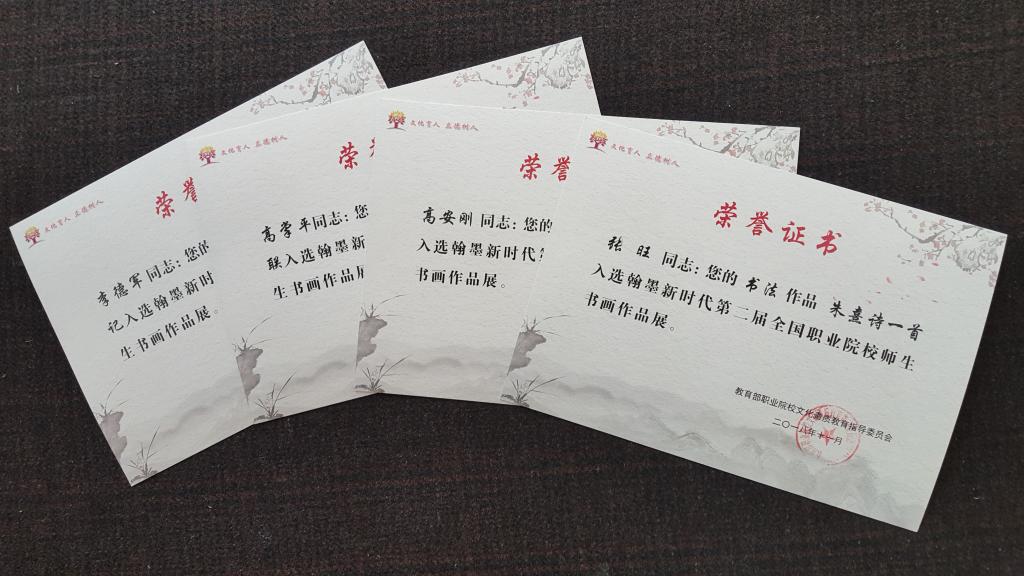 据了解,“翰墨新时代”——第二届全国职业院校师生书画作品展由教育部职业院校文化素质教育指导委员会主办,北京青年政治学院、陕西铁路工程职业技术学院承办。旨在贯彻落实党的十九大精神和全国教育大会习近平总书记关于“坚持中国特色社会主义教育发展道路,培养德智体美劳全面发展的社会主义建设者和接班人”重要讲话精神,继承和弘扬中国传统文化,为职业院校的广大书画爱好者提供交流和展示平台,展示立德树人融入职业教育的丰硕成果。在书画艺术中心老师的指导下,我院共选送15名师生的书法作品参加本次展览,最终4位师生作品脱颖而出,获得了专家好评。