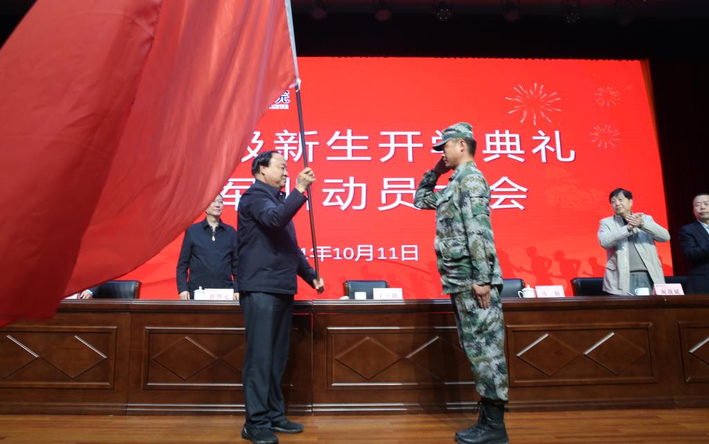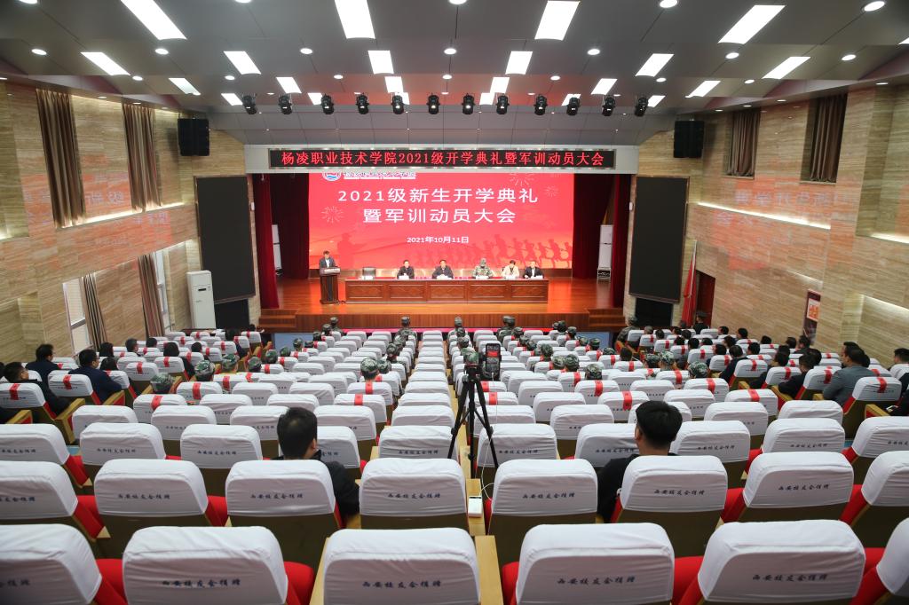 10月11日下午2:30分,伴随着庄严的国歌声,杨凌职业技术学院2021级新生开学典礼暨军训动员大会在南校区思辩堂举行。校长王周锁向军训团授旗并作开学讲话,本次军训团团长马防作军训动员讲话,党委副书记任得元,党委副书记、纪委书记王勇胜,副校长祝战斌、胡俊鹏出席大会。大会由党委副书记、纪委书记王勇胜主持。