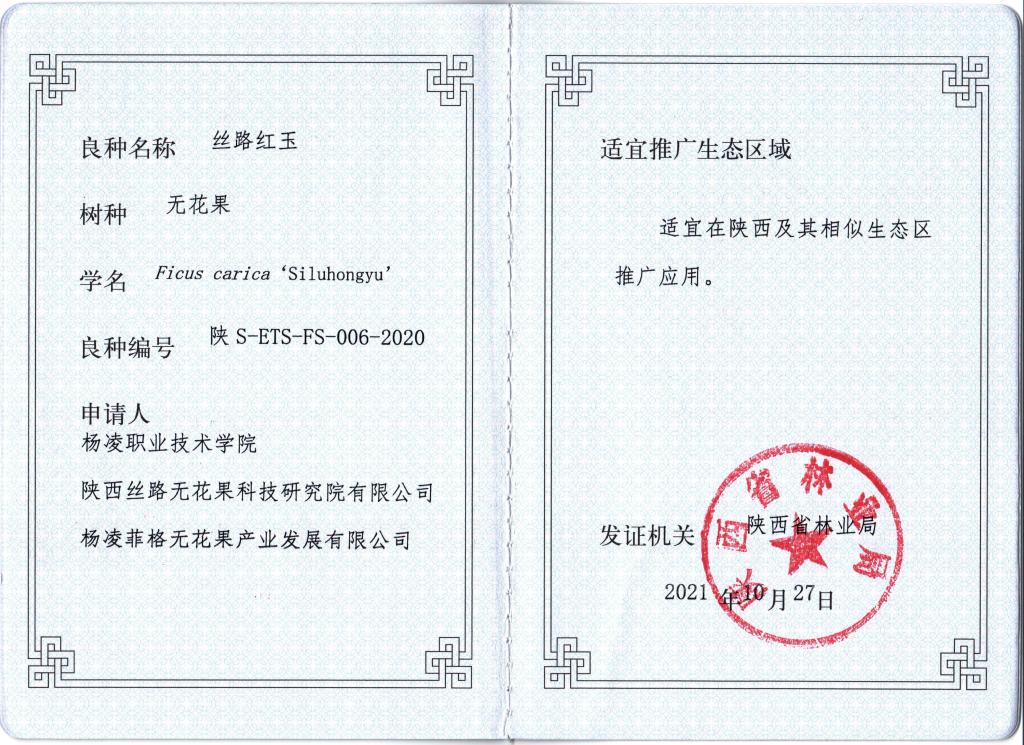 “丝路红玉”、“丝路黄金”2个品种由杨凌职业技术学院作为第一单位,联合陕西丝路无花果科技研究院有限公司和杨凌菲格无花果产业发展有限公司,经过5年研究培育而成。“丝路红玉”新品种果皮紫红色、果肉浅红色,果面光洁、色泽均匀,单果重大,丰产性强,商品性极佳,鲜食特性明显优于其他品种。“丝路黄金”新品种果皮浅黄褐色、果肉浅红色、果面色泽均匀、单果重较大、含糖量高,果干的色泽更好,非常适合制干。