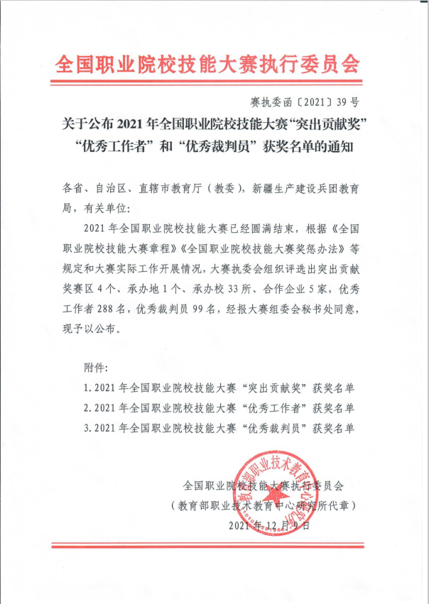 近日,全国职业院校技能大赛执行委员会公布了2021年全国职业院校技能大赛“突出贡献奖”、“优秀工作者”和“优秀裁判员”获奖名单,我校荣获“突出贡献奖”,生物工程学院副院长王燕被评为“优秀工作者”。