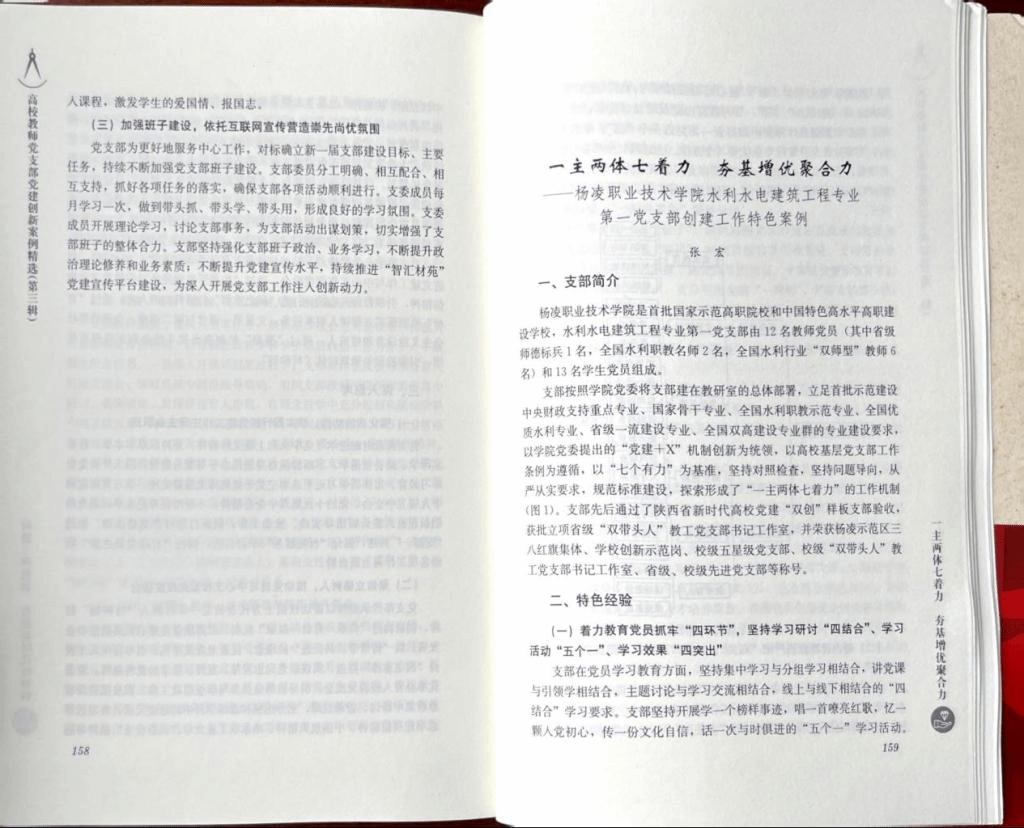 近日,由全国党员教育培训示范基地、华中师范大学培训中心组织编撰的《高校教师党支部党建创新案例精选》(第三辑),经华中师范大学出版社正式出版全国发行。学校水利工程学院《“一主两体七着力,夯基增优聚合力”——一杨凌职业技术学院水利水电建筑工程专业第一党支部创建工作特色案例》成功入选。