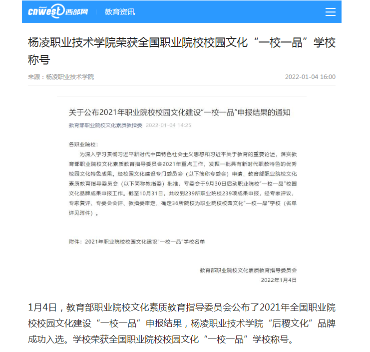 1月4日,教育部职业院校文化素质教育指导委员会公布了2021年全国职业院校校园文化建设“一校一品”申报结果,杨凌职业技术学院“后稷文化”品牌成功入选。学校荣获全国职业院校校园文化“一校一品”学校称号。