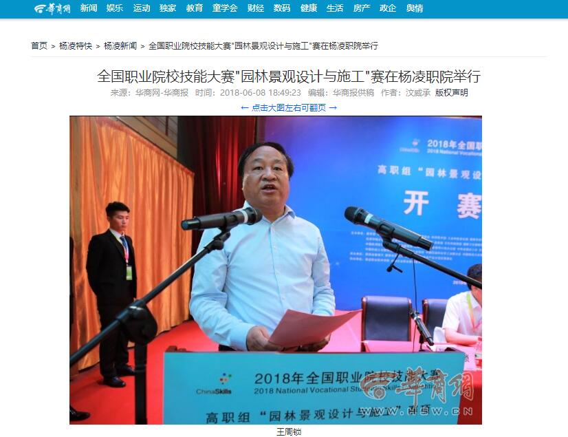 陕西分赛区组委会副主任、陕西省委高教工委委员、省教育厅副厅长、省高教局副局长刘建林致辞,并宣布2018年全国职业院校技能大赛(高职组)“园林景观设计与施工”赛项正式开赛。中央农业广播电视学校副校长田桂山,教育部行指委工作办公室常务副主任王国川,赛项执委会副主任、杨凌职业技术学院党委书记赵曼分别致辞。陕西分赛区组委会委员、赛项执委会副主任、杨凌职业技术学院院长王周锁主持开赛仪式。