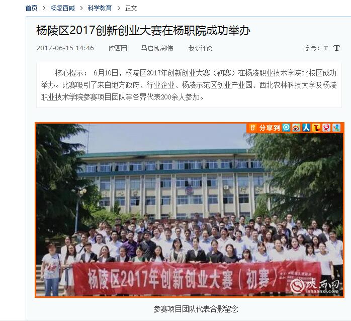 6月10日,杨陵区2017年创新创业大赛(初赛)在杨凌职业技术学院北校区成功举办。比赛吸引了来自地方政府、行业企业、杨凌示范区创业产业园、西北农林科技大学及杨凌职业技术学院参赛项目团队等各界代表200余人参加。