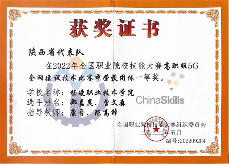 阳光讯(陈阳 崔晓 记者 赵小康)8月22日至23日,2022年全国职业院校技能大赛高职组“5G全网建设技术”赛项在济南职业学院举办,来自全国28个省、56支代表队、112名选手参加了比赛。经过8个小时的激烈比拼,杨凌职业技术学院信息工程学院学生郑嘉昊、曹文森以总分排名全国第一的成绩,荣获一等奖第一名,取得杨凌职院自参赛以来历史最好成绩,指导教师康晋、陈高锋荣获大赛优秀指导教师奖。