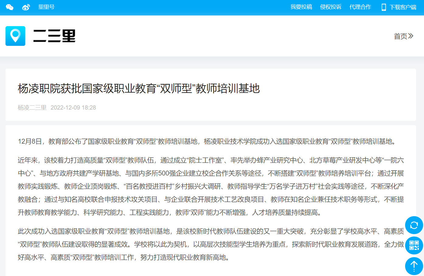 12月8日,教育部公布了国家级职业教育“双师型”教师培训基地,杨凌职业技术学院成功入选国家级职业教育“双师型”教师培训基地。