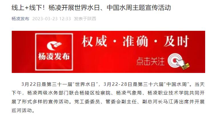 3月22日是第三十一届“世界水日”,3月22-28日是第三十六届“中国水周”。当天下午,杨凌两级水务部门联合杨陵区检察院、杨凌气象局、杨凌职业技术学院共同开展了形式多样的宣传活动。党工委委员、管委会副主任、副总河长马江涛出席并开展巡河活动。