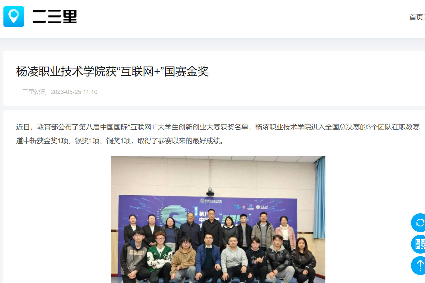 近日,教育部公布了第八届中国国际“互联网+”大学生创新创业大赛获奖名单,杨凌职业技术学院进入全国总决赛的3个团队在职教赛道中斩获金奖1项、银奖1项、铜奖1项,取得了参赛以来的最好成绩。