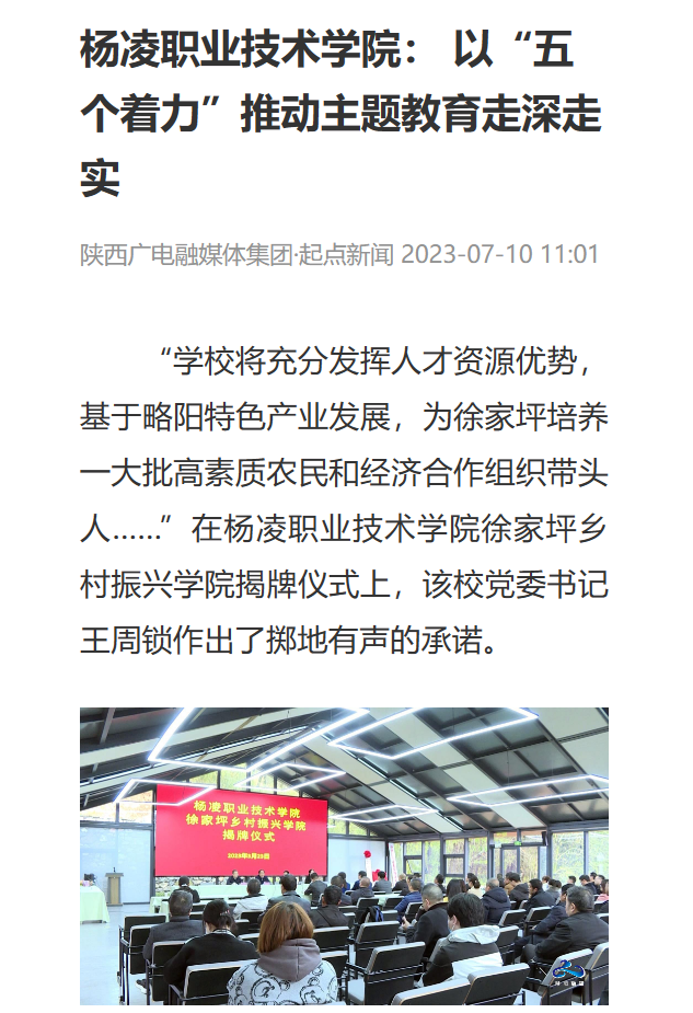 “学校将充分发挥人才资源优势,基于略阳特色产业发展,为徐家坪培养一大批高素质农民和经济合作组织带头人……”在杨凌职业技术学院徐家坪乡村振兴学院揭牌仪式上,该校党委书记王周锁作出了掷地有声的承诺。