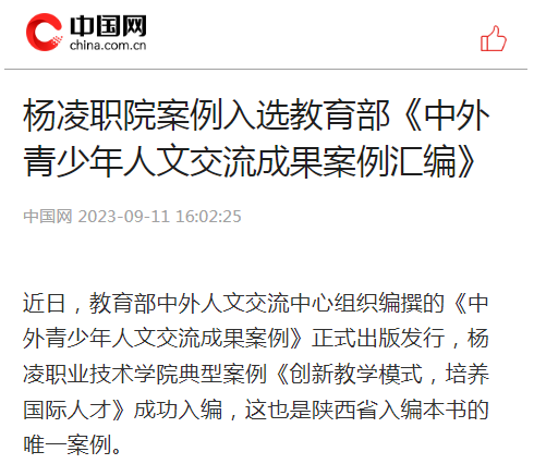 近日,教育部中外人文交流中心组织编撰的《中外青少年人文交流成果案例》正式出版发行,杨凌职业技术学院典型案例《创新教学模式,培养国际人才》成功入编,这也是陕西省入编本书的唯一案例。