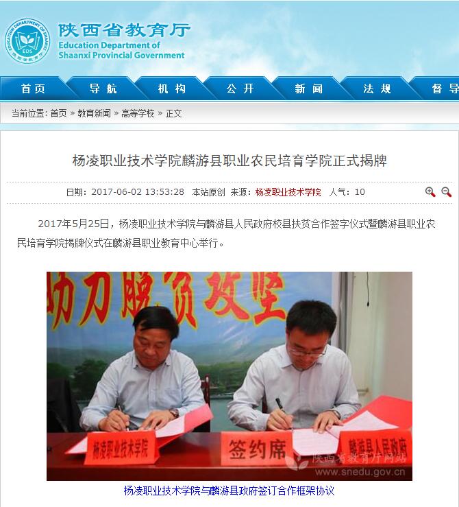 2017年5月25日,杨凌职业技术学院与麟游县人民政府校县扶贫合作签字仪式暨麟游县职业农民培育学院揭牌仪式在麟游县职业教育中心举行。