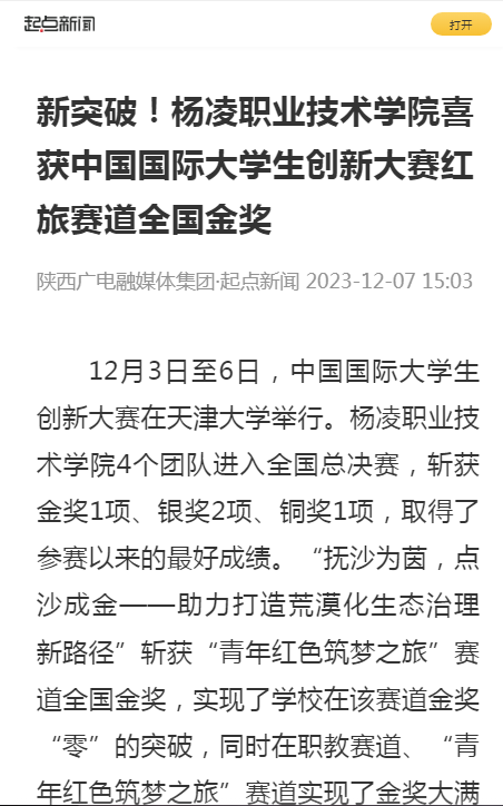 12月3日至6日,中国国际大学生创新大赛在天津大学举行。杨凌职业技术学院4个团队进入全国总决赛,斩获金奖1项、银奖2项、铜奖1项,取得了参赛以来的最好成绩。“抚沙为茵,点沙成金——助力打造荒漠化生态治理新路径”斩获“青年红色筑梦之旅”赛道全国金奖,实现了学校在该赛道金奖“零”的突破,同时在职教赛道、“青年红色筑梦之旅”赛道实现了金奖大满贯,更拿下了陕西省高职院校在红旅赛道的首枚金奖。