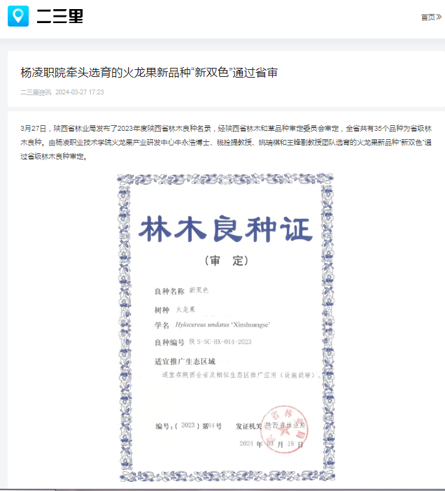 3月27日,陕西省林业局发布了2023年度陕西省林木良种名录,经陕西省林木和草品种审定委员会审定,全省共有35个品种为省级林木良种。由杨凌职业技术学院火龙果产业研发中心牛永浩博士、钱拴提教授、姚瑞祺和王锋副教授团队选育的火龙果新品种“新双色”通过省级林木良种审定。