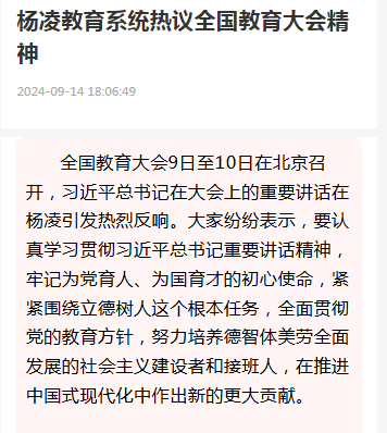 全国教育大会9日至10日在北京召开,习近平总书记在大会上的重要讲话在杨凌引发热烈反响。大家纷纷表示,要认真学习贯彻习近平总书记重要讲话精神,牢记为党育人、为国育才的初心使命,紧紧围绕立德树人这个根本任务,全面贯彻党的教育方针,努力培养德智体美劳全面发展的社会主义建设者和接班人,在推进中国式现代化中作出新的更大贡献。