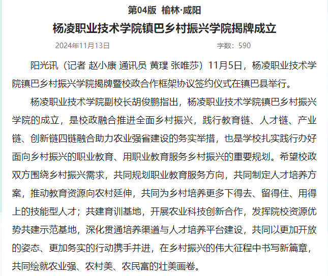 【阳光报】杨凌职业技术学院镇巴乡村振兴学院揭牌成立