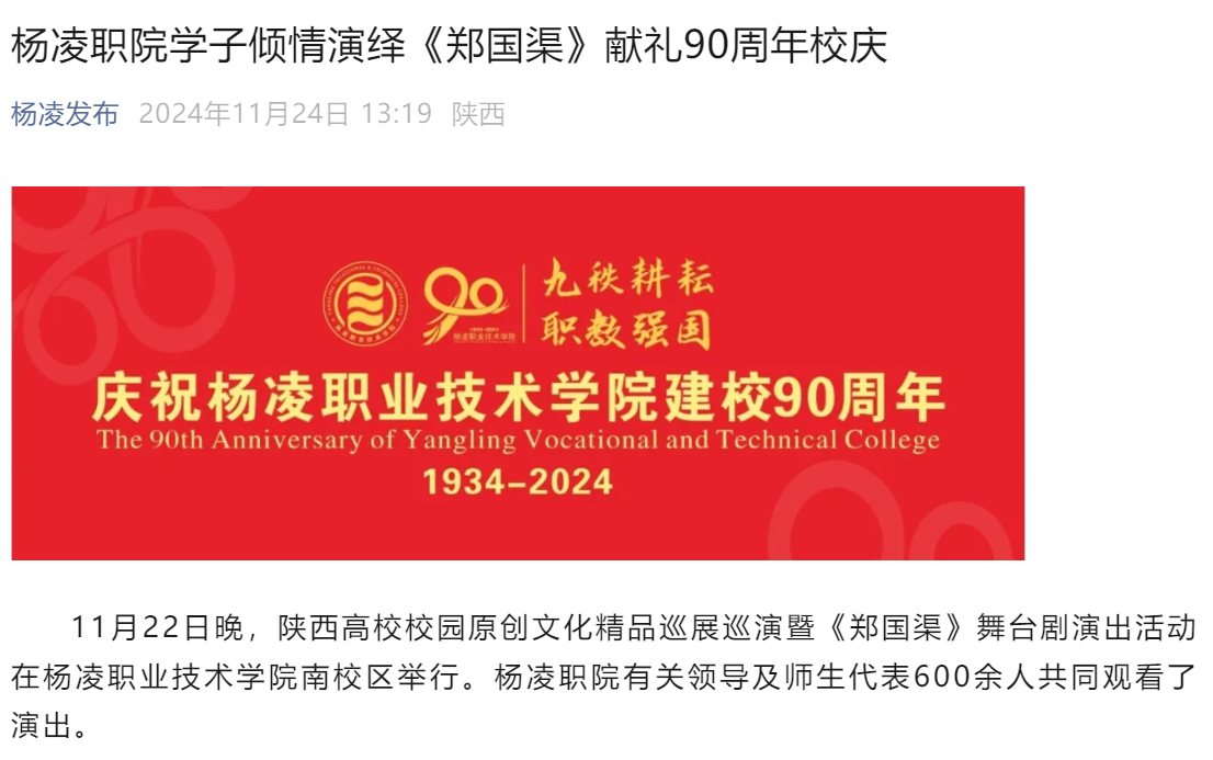 此次演出,不仅为广大师生呈现了一场精彩的视听盛宴,也是杨凌职院学子用实际行动向母校建校90周年献礼。