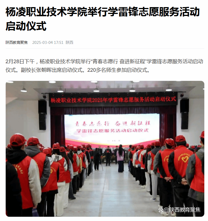 长期以来,杨凌职业技术学院青年志愿者始终秉持“奉献、友爱、互助、进步”的志愿精神,积极参与各类社会服务活动,展现了新时代青年的责任与担当,取得了显著的社会效益和广泛赞誉。学校将持续健全志愿服务制度体系,创新志愿服务工作模式,深化志愿服务品牌建设,推动志愿服务专业化、常态化、长效化发展,引导更多杨职青年在服务社会需求中增长才干、彰显价值,为学校发展注入青春动能。(通讯员 孙雪冰)