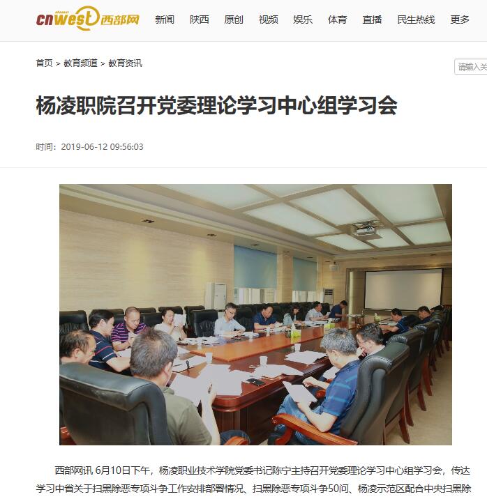 西部网讯 6月10日下午,杨凌职业技术学院党委书记陈宁主持召开党委理论学习中心组学习会,传达学习中省关于扫黑除恶专项斗争工作安排部署情况、扫黑除恶专项斗争50问、杨凌示范区配合中央扫黑除恶督导工作方案、中央督导杨凌示范区扫黑除恶工作任务清单,以及中省“不忘初心 牢记使命”主题教育工作会议精神、《陕西省高校意识形态工作责任制实施细则》和全国深化职业教育改革电视电话会议精神。党委中心组成员及各部门主要负责人参加学习会。