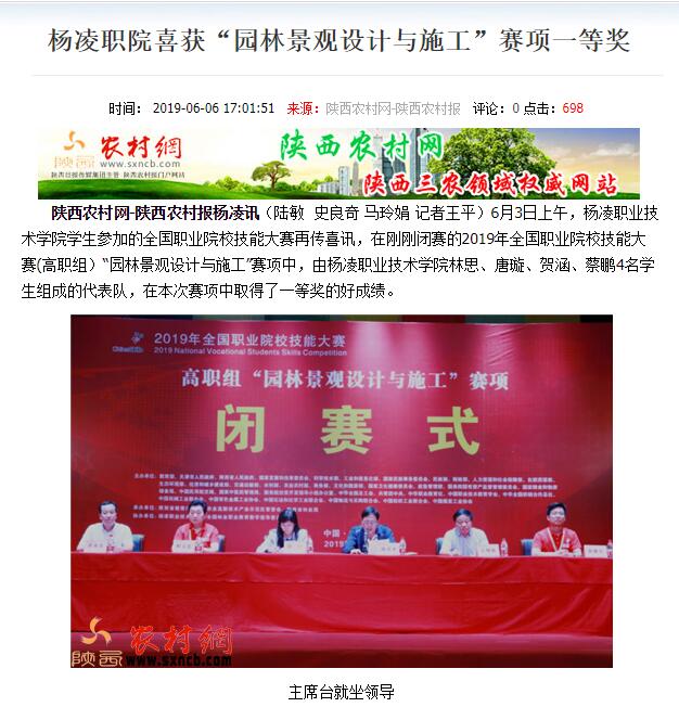 陕西农村网-陕西农村报杨凌讯(陆敏 史良奇 马玲娟 记者王平)6月3日上午,杨凌职业技术学院学生参加的全国职业院校技能大赛再传喜讯,在刚刚闭赛的2019年全国职业院校技能大赛(高职组)“园林景观设计与施工”赛项中,由杨凌职业技术学院林思、唐璇、贺涵、蔡鹏4名学生组成的代表队,在本次赛项中取得了一等奖的好成绩。