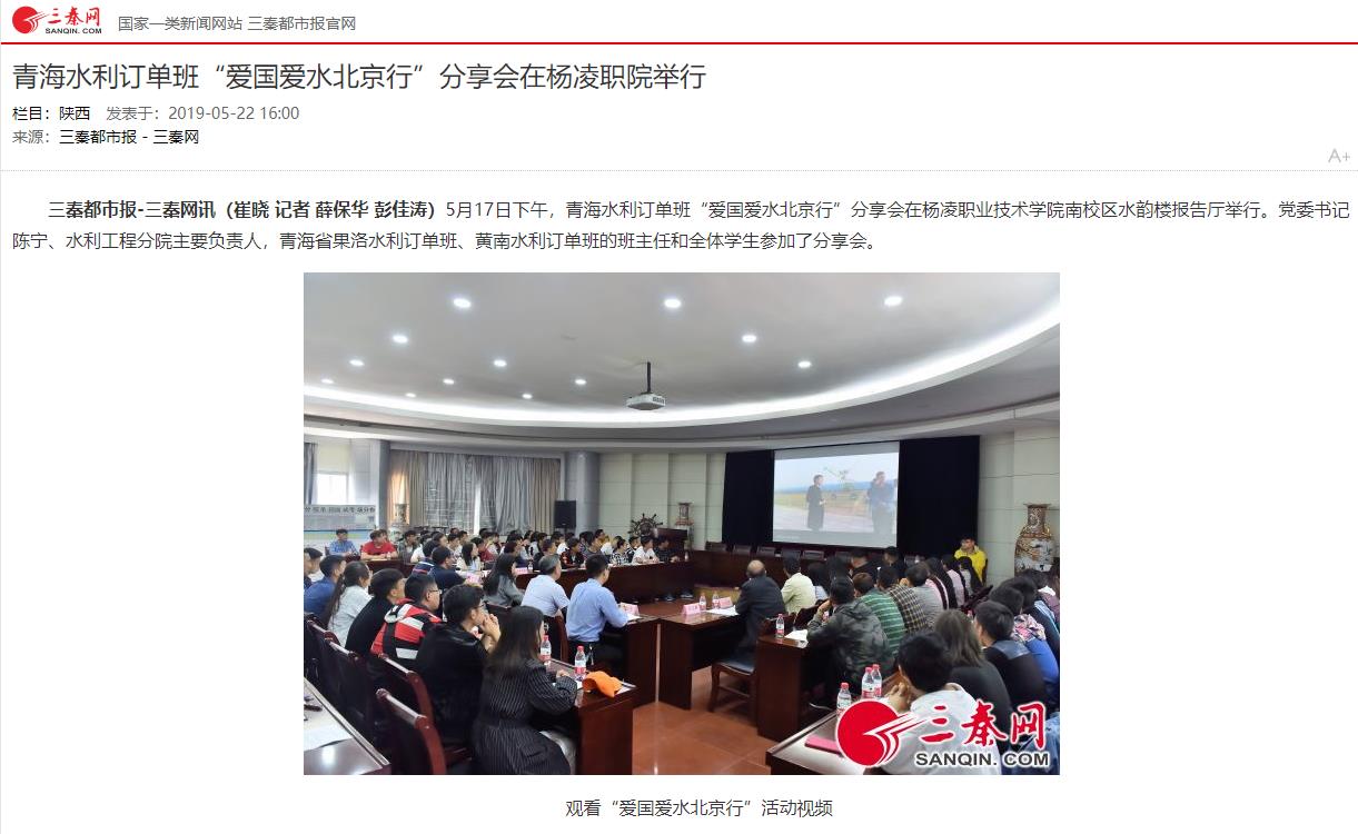 三秦都市报-三秦网讯(崔晓 记者 薛保华 彭佳涛)5月17日下午,青海水利订单班“爱国爱水北京行”分享会在杨凌职业技术学院南校区水韵楼报告厅举行。党委书记陈宁、水利工程分院主要负责人,青海省果洛水利订单班、黄南水利订单班的班主任和全体学生参加了分享会。