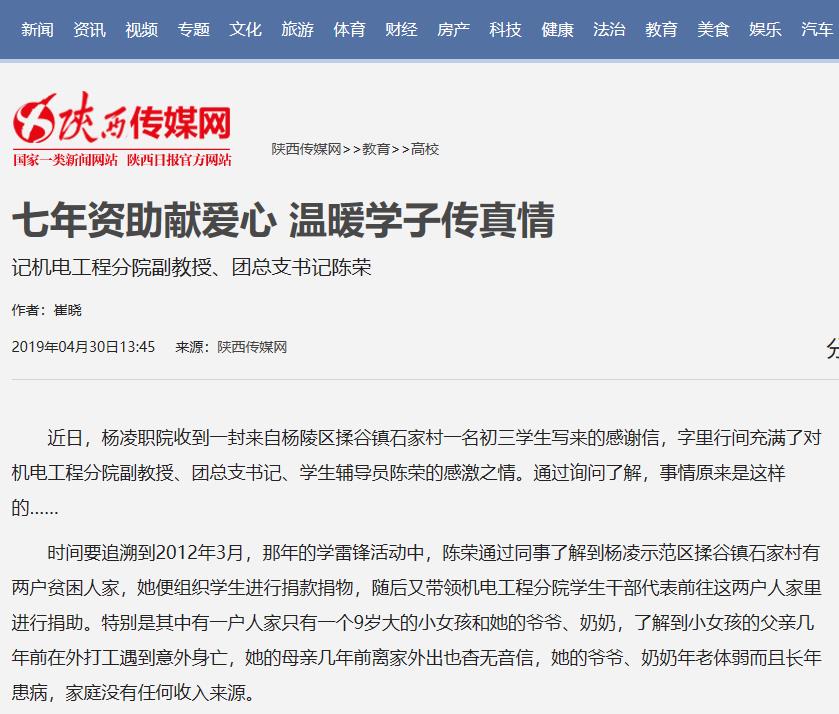 时间要追溯到2012年3月,那年的学雷锋活动中,陈荣通过同事了解到杨凌示范区揉谷镇石家村有两户贫困人家,她便组织学生进行捐款捐物,随后又带领机电工程分院学生干部代表前往这两户人家里进行捐助。特别是其中有一户人家只有一个9岁大的小女孩和她的爷爷、奶奶,了解到小女孩的父亲几年前在外打工遇到意外身亡,她的母亲几年前离家外出也杳无音信,她的爷爷、奶奶年老体弱而且长年患病,家庭没有任何收入来源。