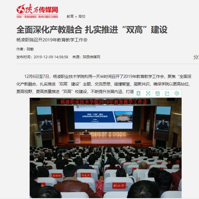 12月6日至7日,杨凌职业技术学院利用一天半时间召开了2019年教育教学工作会,聚焦“全面深化产教融合,扎实推进‘双高’建设”主题,交流思想、碰撞智慧、凝聚共识,确保学院以更高站位、更高视野、更高质量推进“双高”校建设,不断提升发展内涵,打造品牌特色。