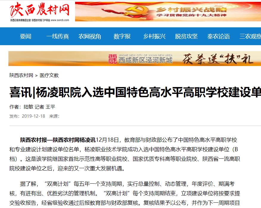 陕西农村报—陕西农村网杨凌讯12月18日,教育部与财政部公布了中国特色高水平高职学校和专业建设计划建设单位名单,杨凌职业技术学院成功入选中国特色高水平高职学校建设单位(B档)。这是该学院继国家首批示范性高等职业院校、国家优质专科高等职业院校、陕西省一流高职院校建设单位之后,迎来的又一次重大发展机遇。