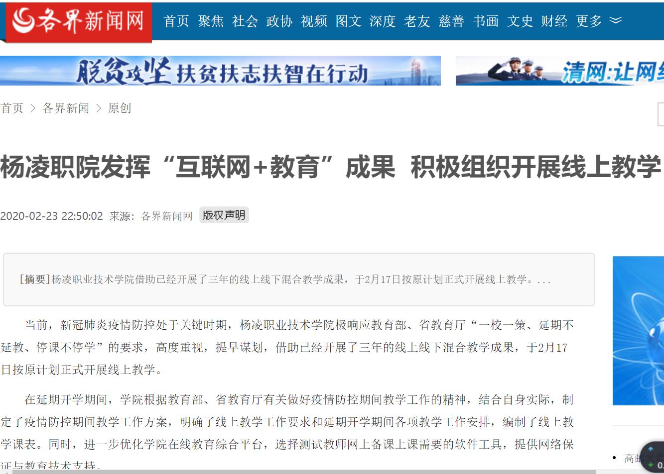 当前,新冠肺炎疫情防控处于关键时期,杨凌职院技术学院积极响应教育部、省教育厅“一校一策、延期不延教、停课不停学”的要求,高度重视,提早谋划,借助已经开展了三年的线上线下混合教学成果,于2月17日按原计划正式开展线上教学。
