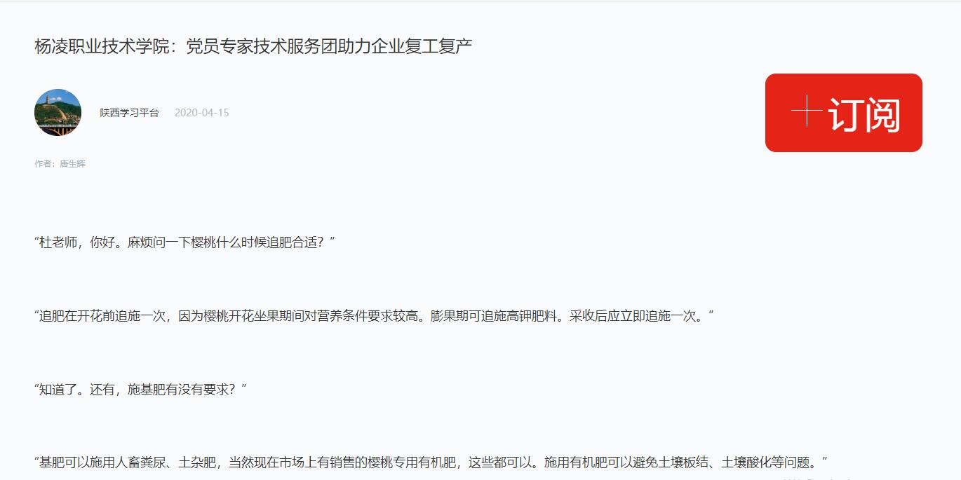 杜璨是陕西杨凌职业技术学院生物工程学院引进的一名博士,主要的研究方向是土壤肥料学。作为一名党员,杜璨的孩子刚过满月,他就主动加入到生物工程学院党员技术服务团队中,通过微信为杨凌新民专业合作社提供技术指导。