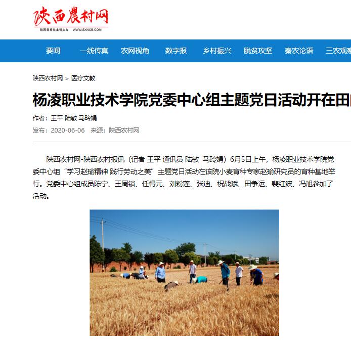 陕西农村网-陕西农村报讯(记者 王平 通讯员 陆敏  马玲娟)6月5日上午,杨凌职业技术学院党委中心组“学习赵瑜精神 践行劳动之美”主题党日活动在该院小麦育种专家赵瑜研究员的育种基地举行。党委中心组成员陈宁、王周锁、任得元、刘粉莲、张迪、祝战斌、田争运、裴红波、冯旭参加了活动。