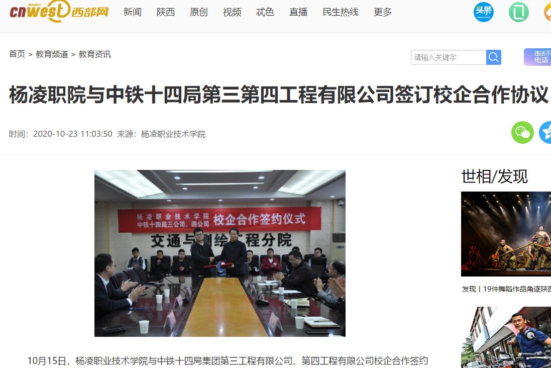 10月15日,杨凌职业技术学院与中铁十四局集团第三工程有限公司、第四工程有限公司校企合作签约仪式举行。第四工程有限公司人才资源部部长朱家宽、兴安盟项目部办公室主任蒲松柏,第三工程有限公司人才资源部曹杰;杨凌职业技术学院招生就业处处长袁军儒,交通与测绘工程分院院长张养安、副院长周波,以及部分教师、2021届毕业生代表参加了签约仪式。