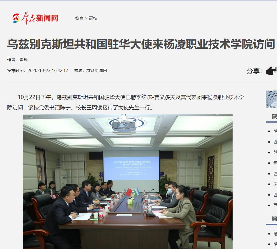 10月22日下午,乌兹别克斯坦共和国驻华大使巴赫季约尔•赛义多夫及其代表团来杨凌职业技术学院访问,该校党委书记陈宁、校长王周锁接待了大使先生一行。